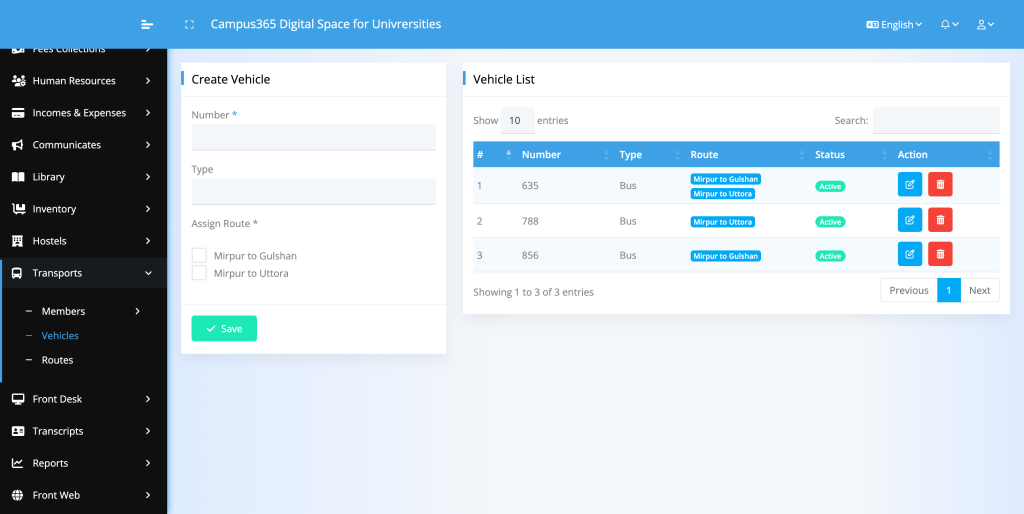 The Transportation module in Campus365 is designed to manage all campus transport services in a structured and transparent manner. It covers vehicle management, route scheduling, driver assignment, fuel tracking, and passenger management.