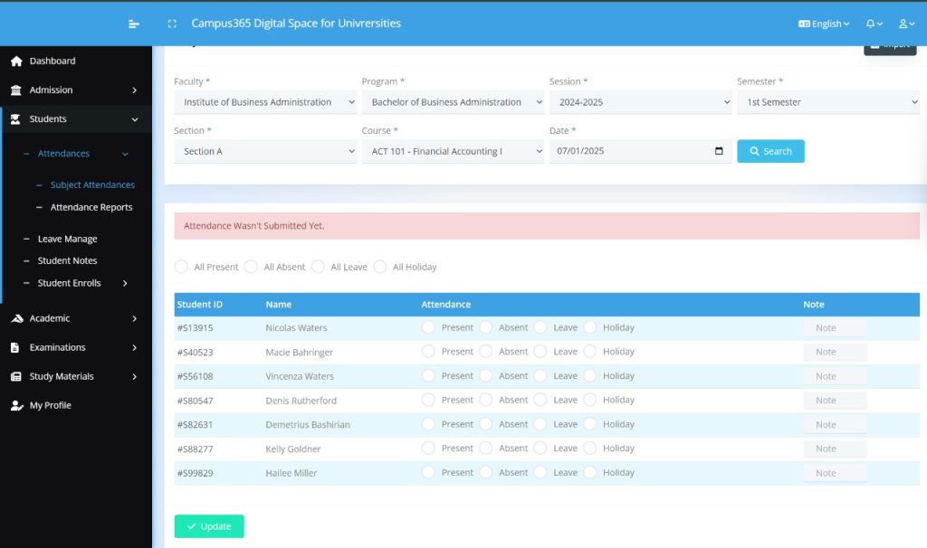 Campus365 delivered a complete University Management ERP system for Canadian University Bangladesh, replacing scattered software with a fully integrated academic-administrative backbone. All campus operations academic, HR, student services, workflows and approval systems were centralized under one University ERP umbrella.